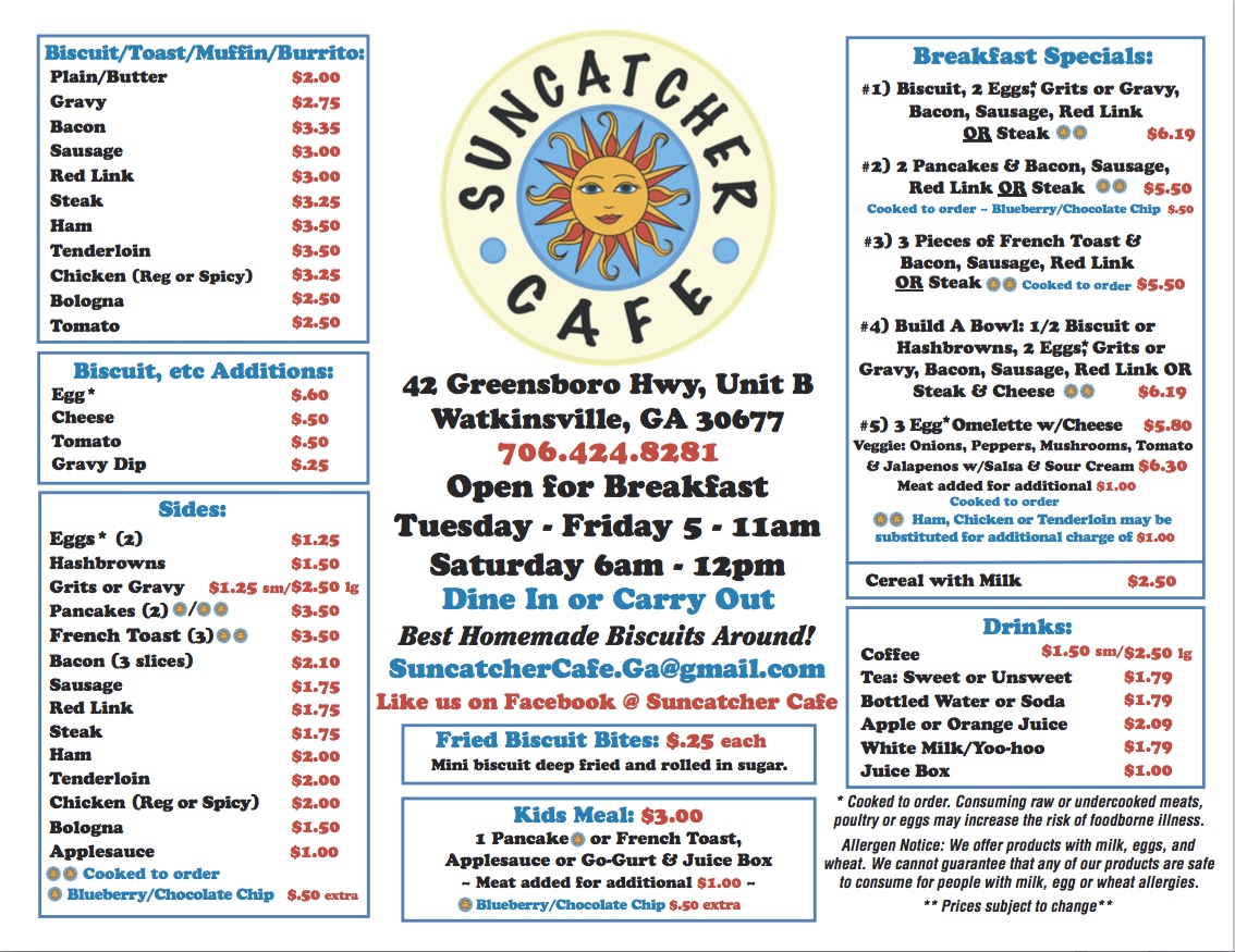 The menu at Suncatcher Cafe in Watkinsville brings together homestyle breakfast favorites and hearty portions that feel both comforting and satisfying. Their Breakfast Platters and Bowls set the tone, with choices like the Biscuit and 2 Eggs Platter, the fluffy Two Pancakes Platter, or the indulgent Three Piece of French Toast. For those who enjoy a more customized option, the Build a Bowl allows diners to create a breakfast combination suited to their tastes.
